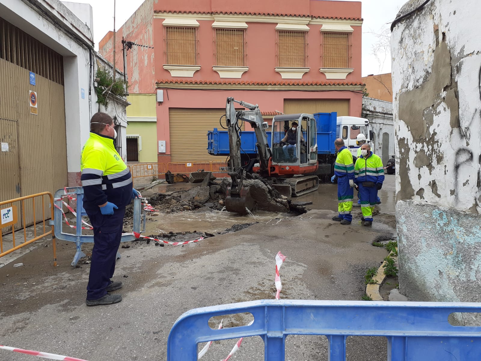 En escasos minutos acudió un equipo de técnicos de Aqualia, que lo primero que hicieron fue dirigirse a calles aledañas, donde se encuentran las válvulas de cierre de esta tubería, para cortar el suministro y evitar que saliera más agua. Pero esta tubería es de gran tamaño (300 mm de diámetro) y lleva un gran caudal en su interior, por lo que esta operación tuvo que hacerse poco a poco para que no se produjera una sobrepresión en su interior que pudiera provocar otras averías aguas arriba.