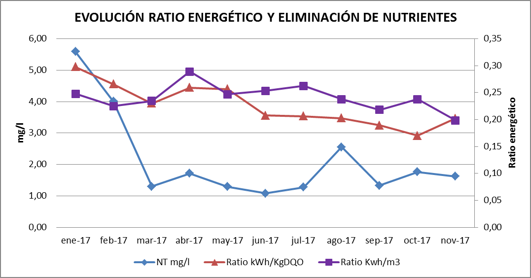 Durante el primer año de explotación se consiguió disminuir el ratio energético kwh/kg DQO equivalente en un 40% y se mejoró el rendimiento de eliminación de nutrientes en más del 60%